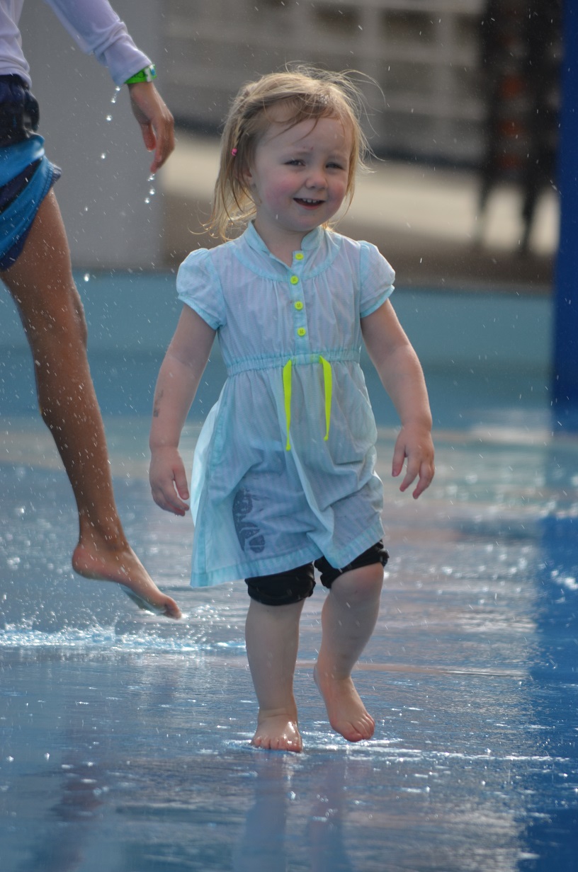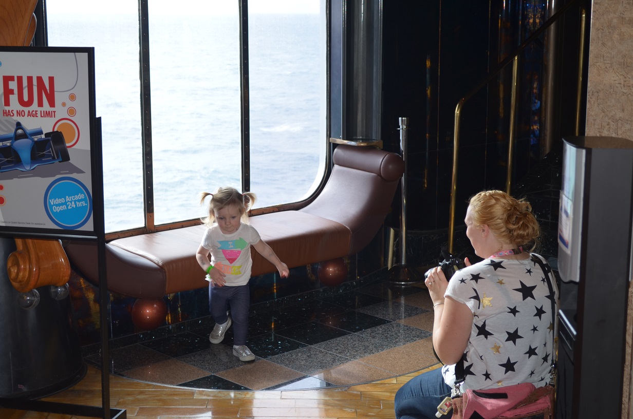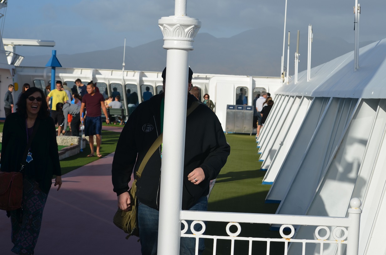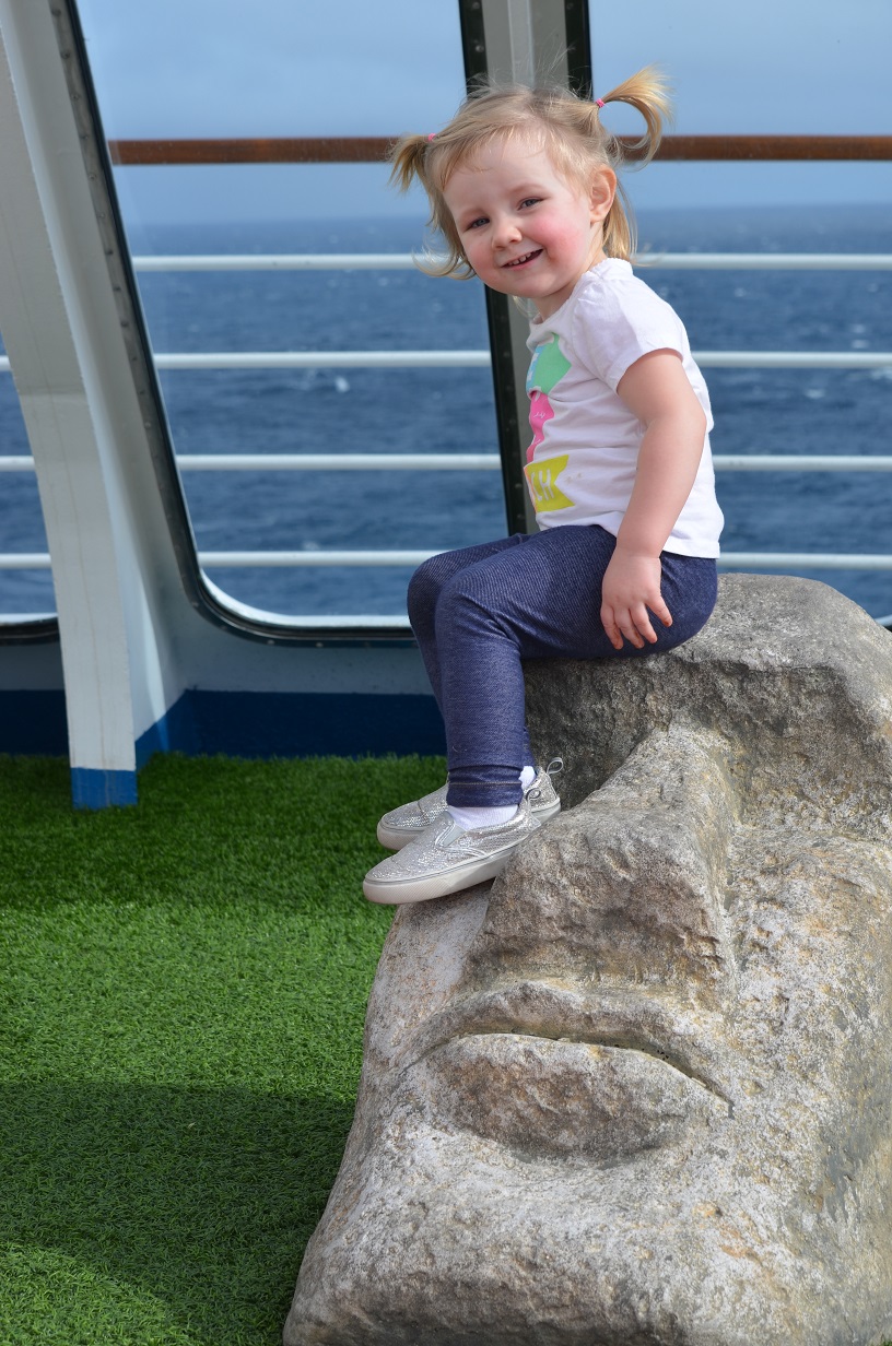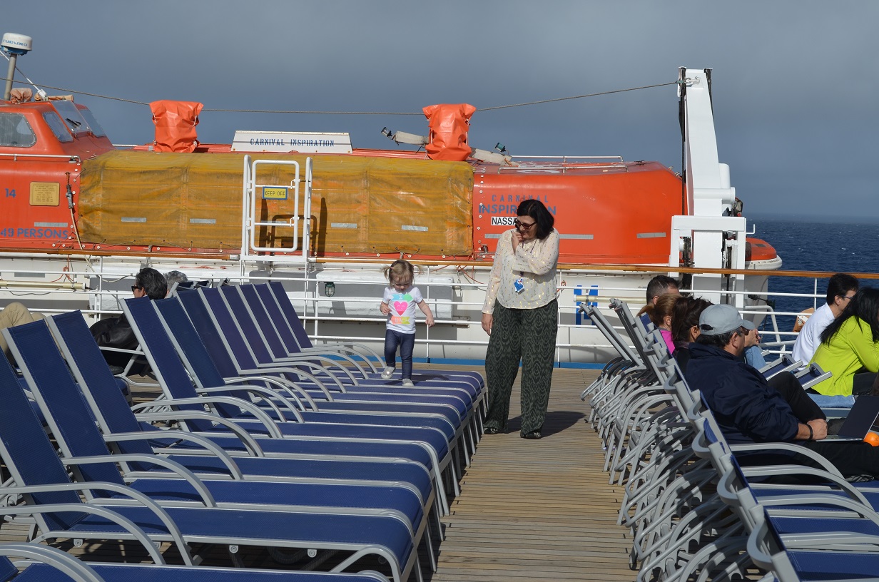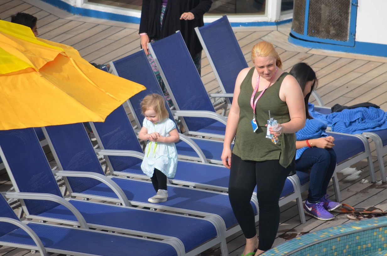 Claire hopping along the empty deck chairs